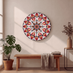 La estructura radial y los motivos florales crean una sensación de expansión suave y orden armónico. El centro actúa como núcleo visual y simbólico, irradiando equilibrio y una energía delicada que se extiende hacia el exterior.