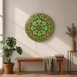 Mandala pintado a mano en acrílico sobre lienzo de algodón con bastidor circular de 50 cm de diámetro. Pieza única que transmite vitalidad, equilibrio y luz interior, inspirada en la energía del sol y la fuerza del centro.